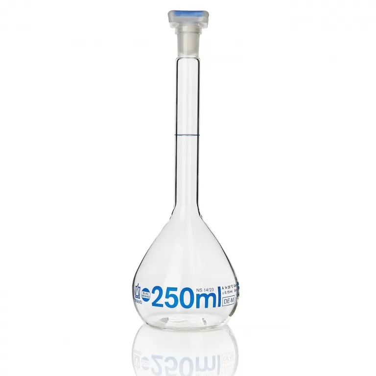 Volumetric flasks have a distinctive pear-shaped design with a long neck and a single calibration mark engraved on the neck or the body of the flask. The calibration mark indicates the precise volume that the flask is designed to hold, such as “250 ml” in the case of a 250ml volumetric flask. The accuracy of volume measurement with a volumetric flask is usually within a small tolerance, such as ±0.05ml or better.